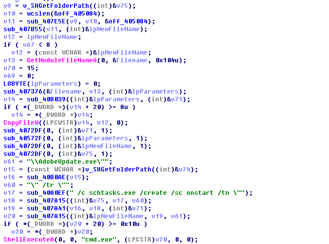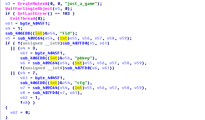 病毒运行后首先检查自身互斥体,注册表信息,当机器已经被感染过,则不再进行二次感染,使用互斥体为just_a_game