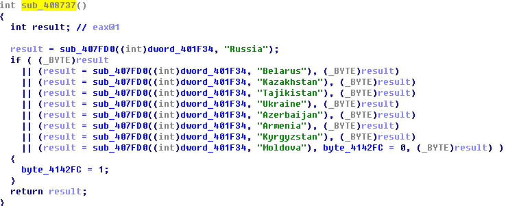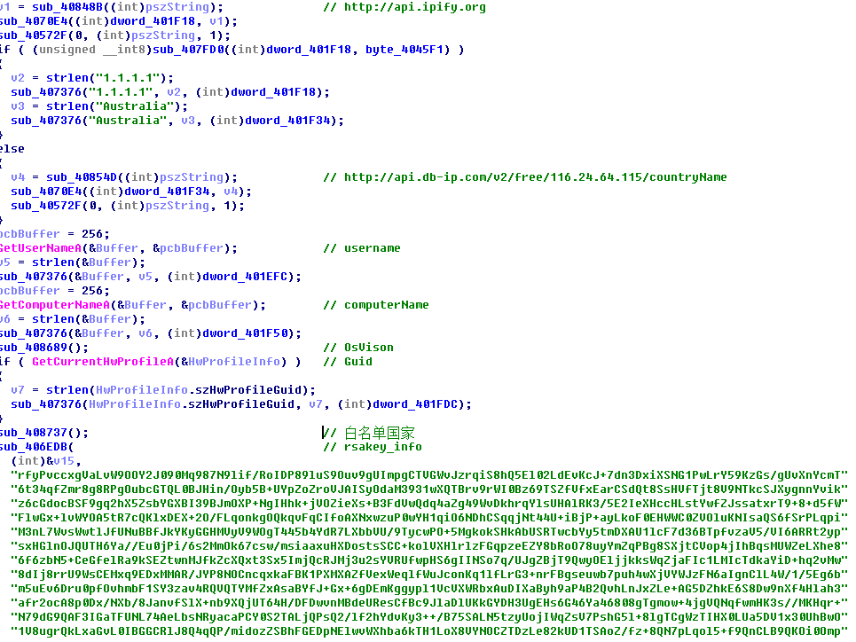 随后获取感染环境ip,国家,用户名,机器名,系统版本,GUID,解密出硬编码的rsa公钥信息,硬盘信息,加密扩展后缀信息等然后上报。在此过程中,会对当前感染的国家进白名单判定,以便在后续加密过程中对白名单国家进行放行,过程中涉及的大部分字串以Base64+RC4加密存放。