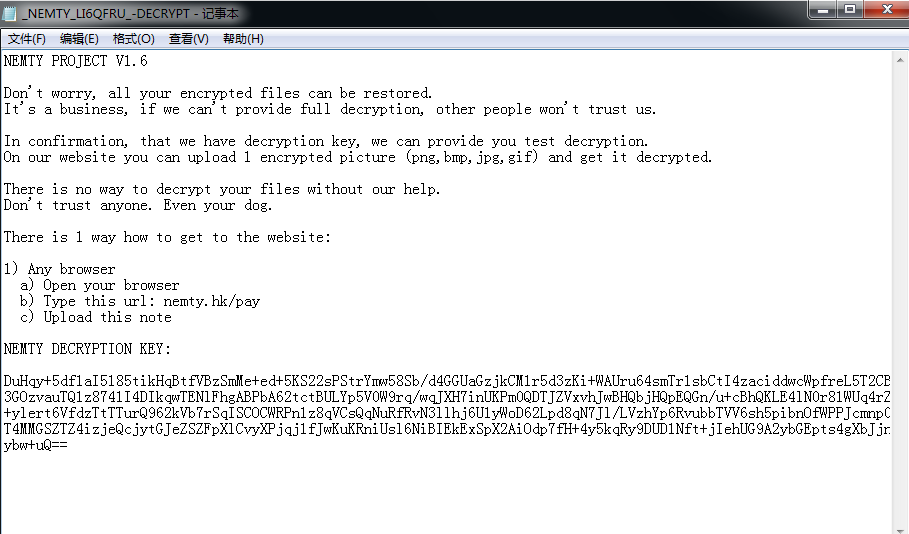 生成加密扩展名_NEMTY_random_-DECRYPT.txt的勒索说明文档,文档标题可看出病毒已更新至v1.6版本。