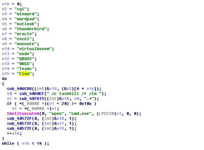 • 病毒加密文件前会结束若干个数据库软件、Office程序的进程,停止相关服务,使加密文件时避免文件锁定而中止;