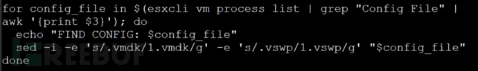 加密器由一个 Shell 脚本文件执行,该脚本文件使用各种命令行参数启动,包括公共 RSA 密钥文件、要加密的文件、不会加密的数据块、加密块的大小和文件尺寸。加密器使用 encrypt.sh shell 脚本启动,该脚本充当攻击背后的逻辑。启动时,脚本将执行以下命令来修改 ESXi 虚拟机的配置文件 (.vmx),以便将字符串“ .vmdk” 和“ .vswp” 更改为“ 1.vmdk” 和“ 1.vswp ”。