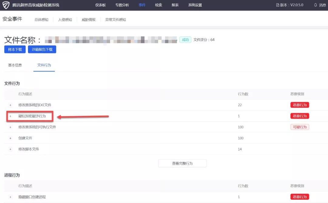 3.企业用户可以使用腾讯御界高级威胁检测系统,御界系统发现可疑邮件,并将可疑邮件的附件通过沙箱分析。在本案例中,御界系统的沙箱功能,分析出危险附件具有可疑的加密敲诈行为。