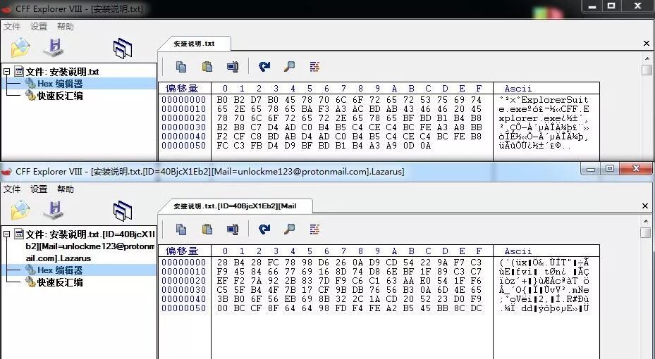 例如如下图中“安装说明.txt”文件被加密为“安装说明.txt.[ID=40BjcX1Eb2][Mail=unlockme123@protonmail.com].Lazarus”