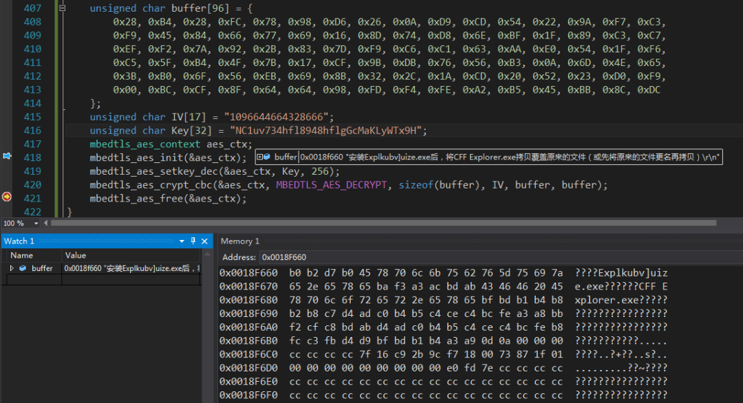 Ouroboros勒索病毒通常使用外壳程序来进行伪装,通过内存可Dump出勒索payload