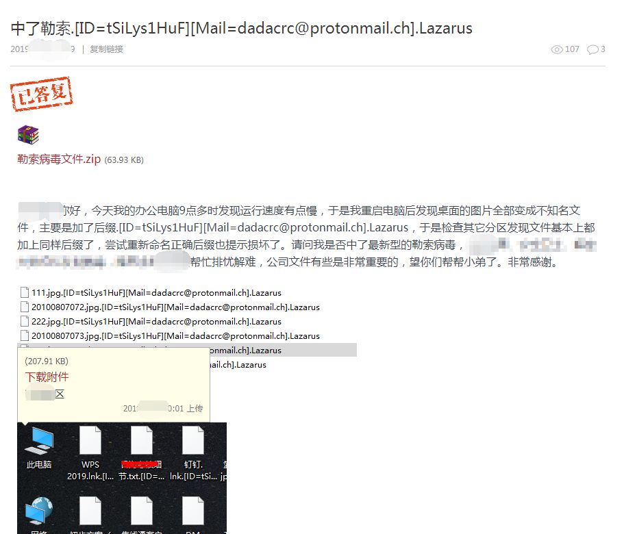 文件被加密为原始文件名.[ID=random][Mail=勒索邮箱号].Lazarus