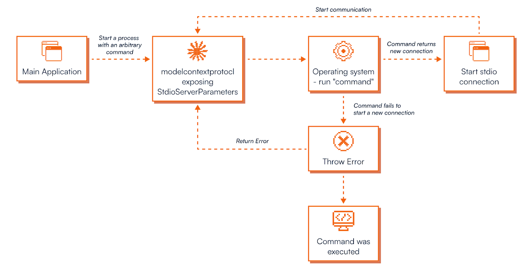 “这段代码原本旨在启动本地 STDIO 服务器,并将 STDIO 的控制权返回给大语言模型(LLM)。但在实际情况中,任何人都可以运行任意操作系统命令。如果该命令成功创建了 STDIO 服务器,它将返回控制权;但如果执行的是其他命令,命令执行后会返回错误信息。”