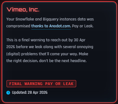 昨天,ShinyHunters 在其勒索门户网站上列出了 Vimeo,声称掌握了该公司 Snowflake 和 BigQuery 实例中的数据。
